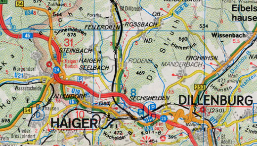 Auszug aus dem ADAC Atlas Allendorf liegt direkt an der A 45.( rot) Die Bundesstraße 277(gelb) teilt das Dorf in zwei Teile .